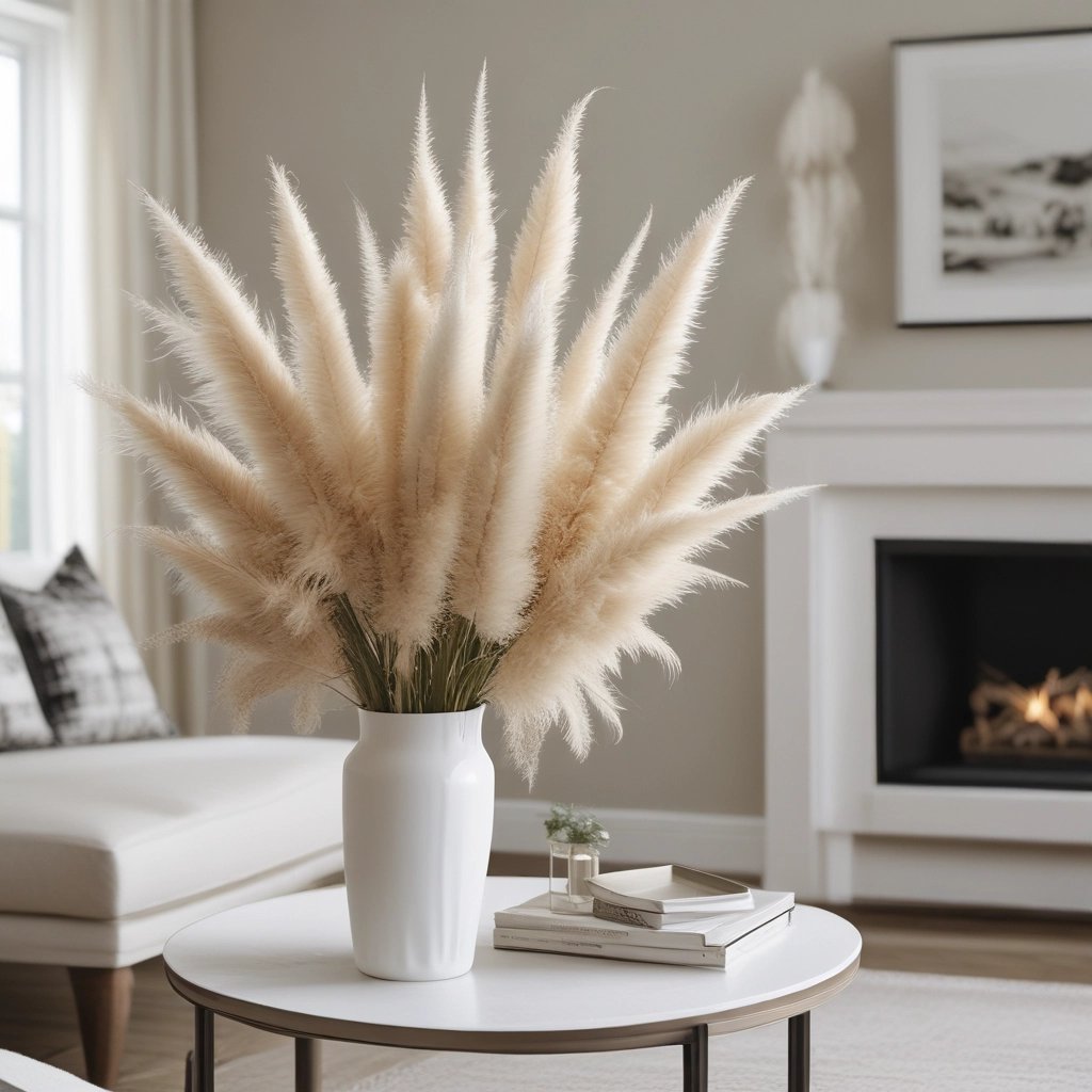 Table centerpieces add softness and personality at eye level. You can mix pampas with dried flowers, candles, or seasonal accents for a layered, welcoming display.